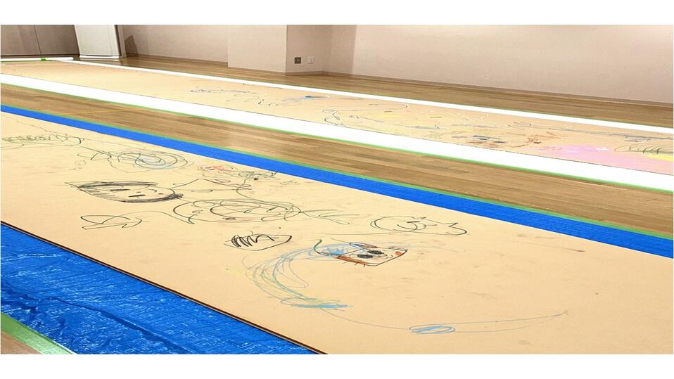 2026年4月12日(日)①10:45~11:15②12:15~12:45床一面の模造紙にクレヨンで自由に好きな絵を描いてあそぼう。