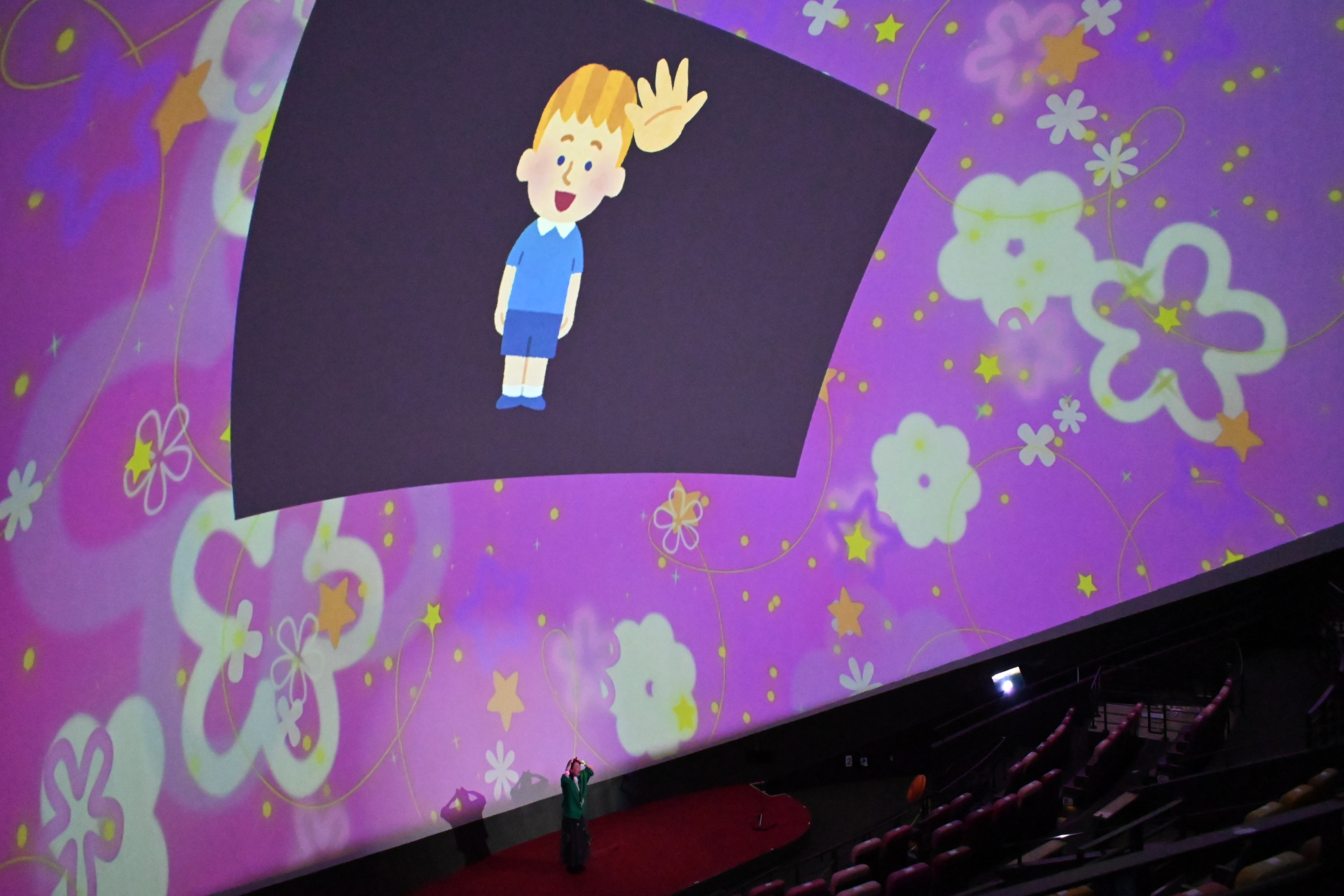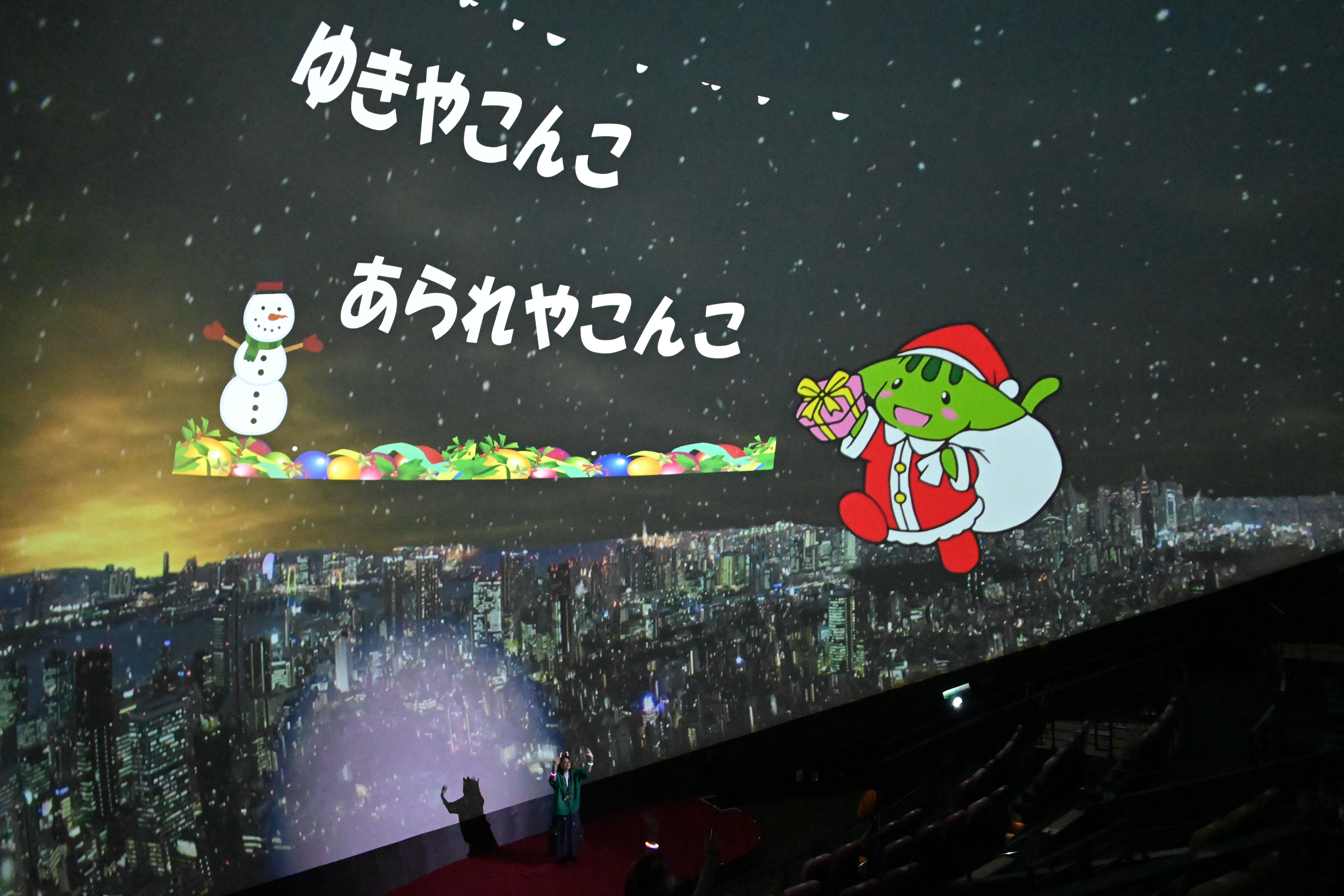 今回のイベントでは、日本の童謡「ゆき」と英語の歌「Head, Shoulders, Knees and Toes」に合わせた手遊びとダンスで、楽しくスタートしました。最初は恥ずかしがっていたお客さまも、スタッフと一緒に少しずつ手遊びに加わり、最後には笑顔でポーズを決めてくれました。続いて、クリスマスの夜空に広がる星々を、生解説でご紹介しました。クリスマスの夜に西の空に輝く十字架の星の並びや、輪がほとんど見えず、串にささったお団子のように見える土星を大きく拡大して映し出すと、お客さまは大興奮。