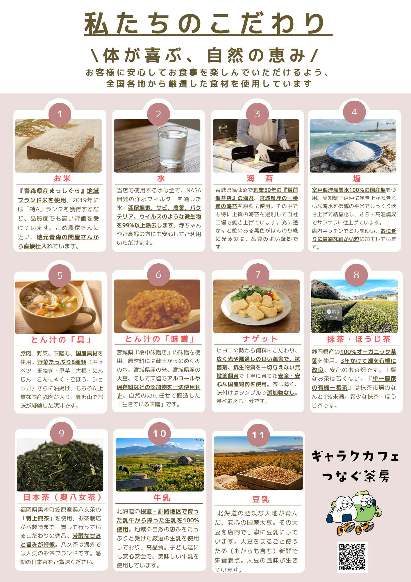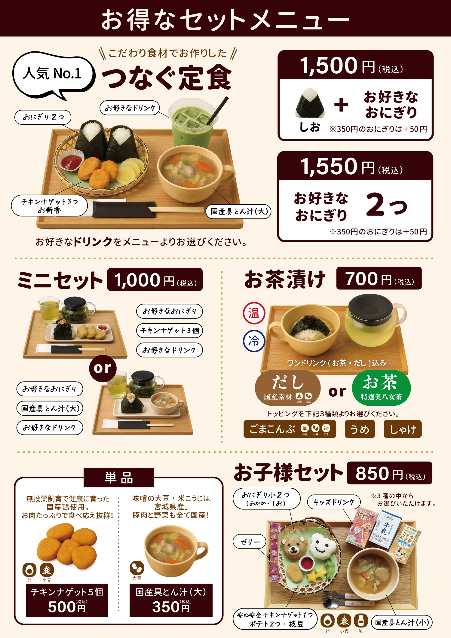 美味しい日本茶を浄水で丁寧に入れた緑茶や、青森県産のお米を浄水で炊いて作ったおにぎり、国産食材で作った豚汁、など、「体に優しいカフェ」をコンセプトに、お子様もご年配の方も安心してお召し上がりいただけるような食事を提供しています。