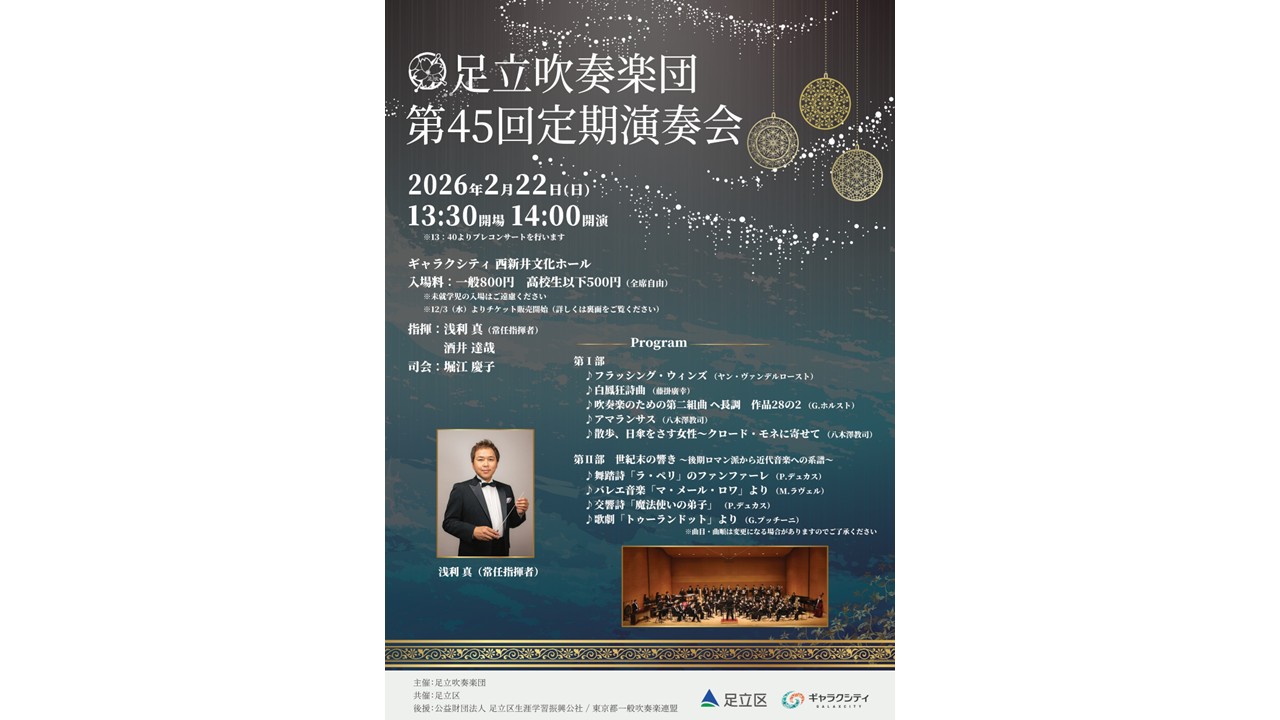 足立吹奏楽団による第45回定期演奏会 ※13:40よりプレコンサートを行います。