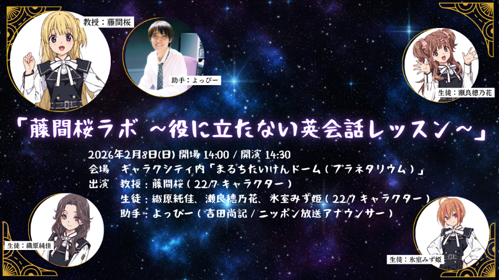 22/7のキャラクター・藤間桜が教授に扮し、「役に立たない英会話レッスン」など、ユニークな講義を展開。藤間桜のほか、織原純佳・氷室みず姫・瀬良穂乃花ら、22/7のキャラクターたちも次々と登場。こちらの講義では、よっぴーが助手(現地MC)としてサポートします。