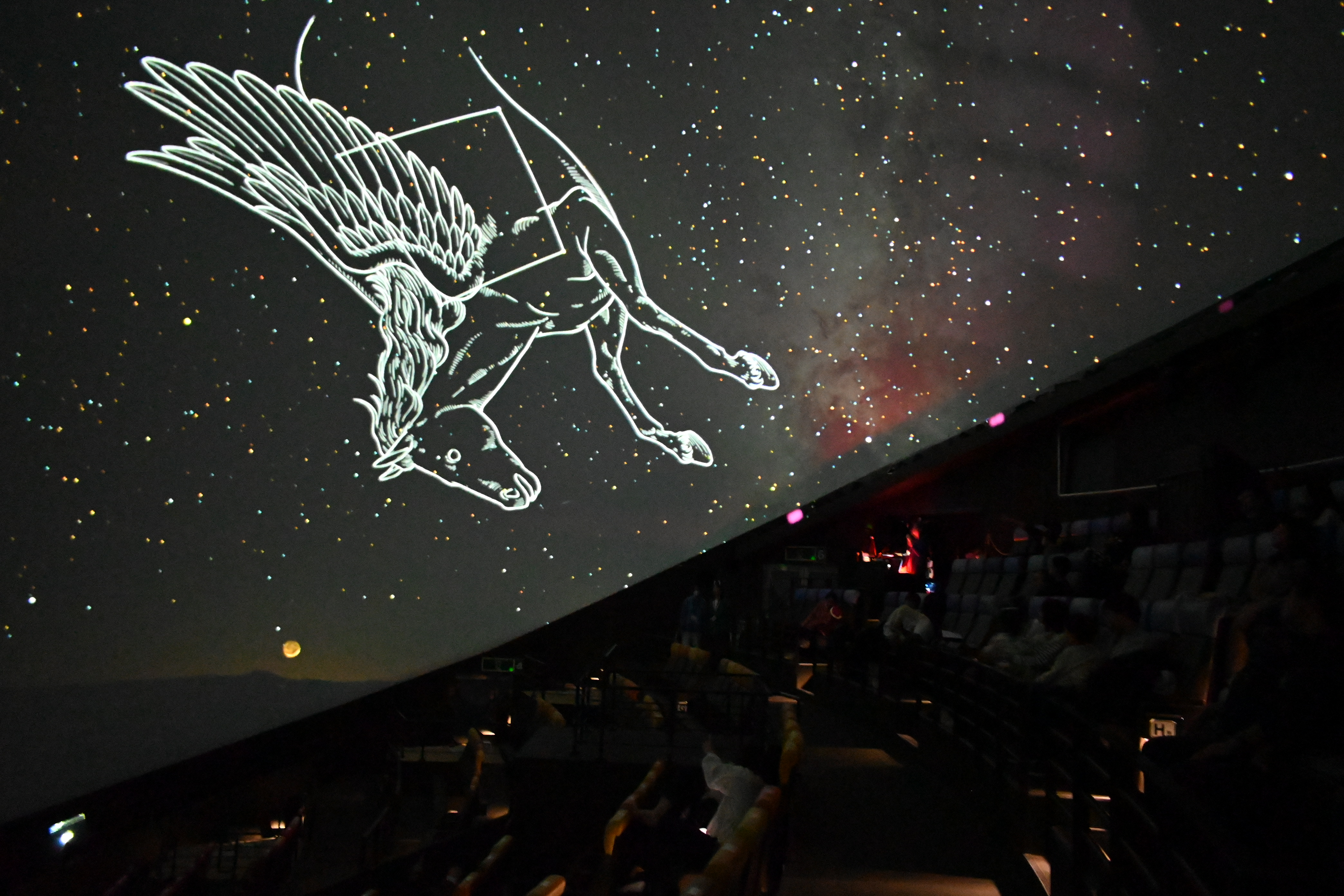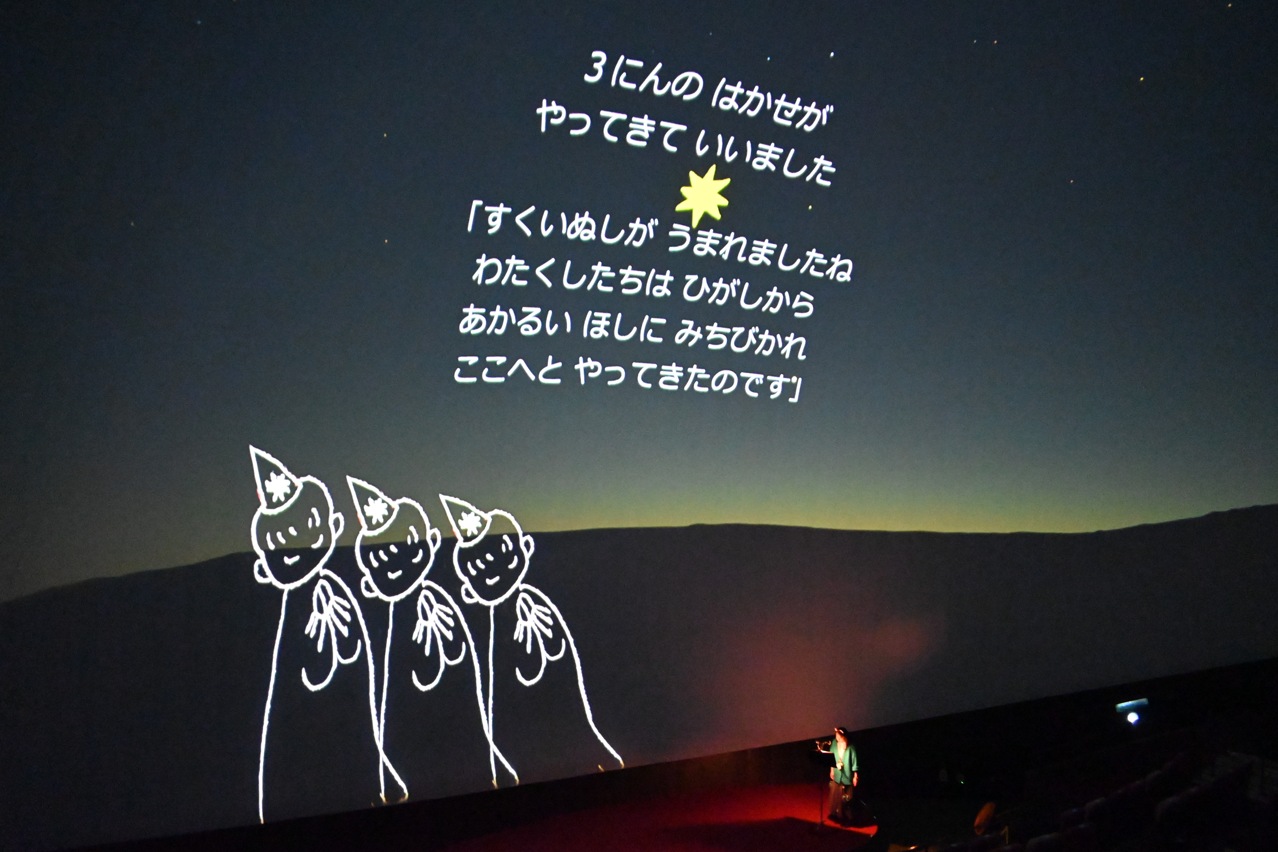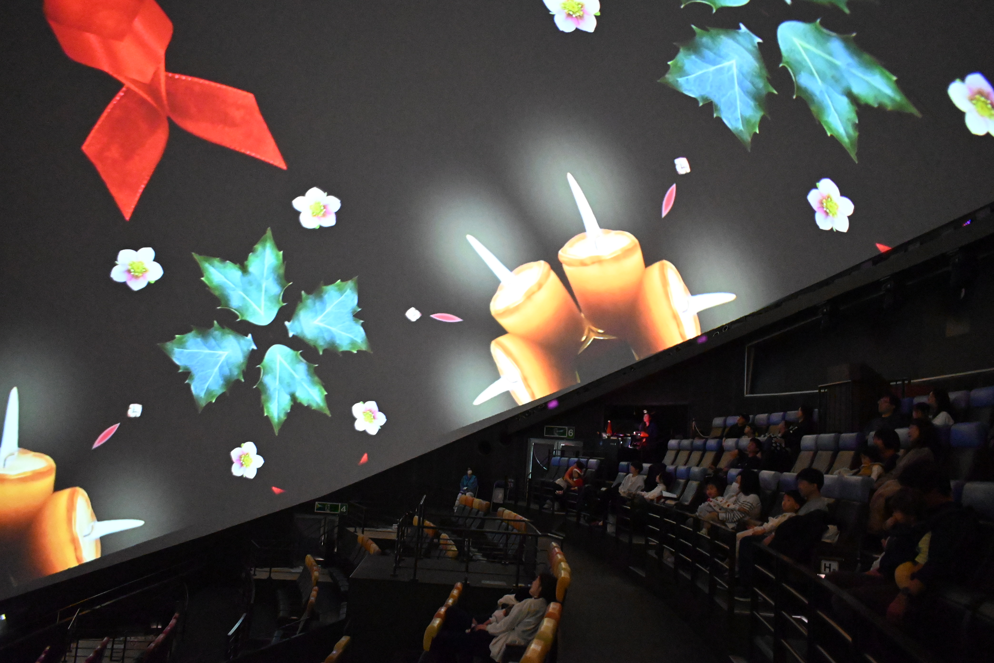 その後、ベツレヘムの星のお話を、落ち着いた雰囲気の中、映像と朗読を交えてお届けしました。そして、アーティスト・渡辺真悠さんによる、クリスマスの伝統的なモチーフを〈万華鏡〉の世界観で描いた幻想的なプラネタリウム映像「クリスマス・アートファンタジー」を上映し、ドーム内はあたたかく華やかな雰囲気に包み込まれました。最後は再びクリスマスの夜の空に戻り、満天の星空や冬の星座たちをお楽しみいただきました。