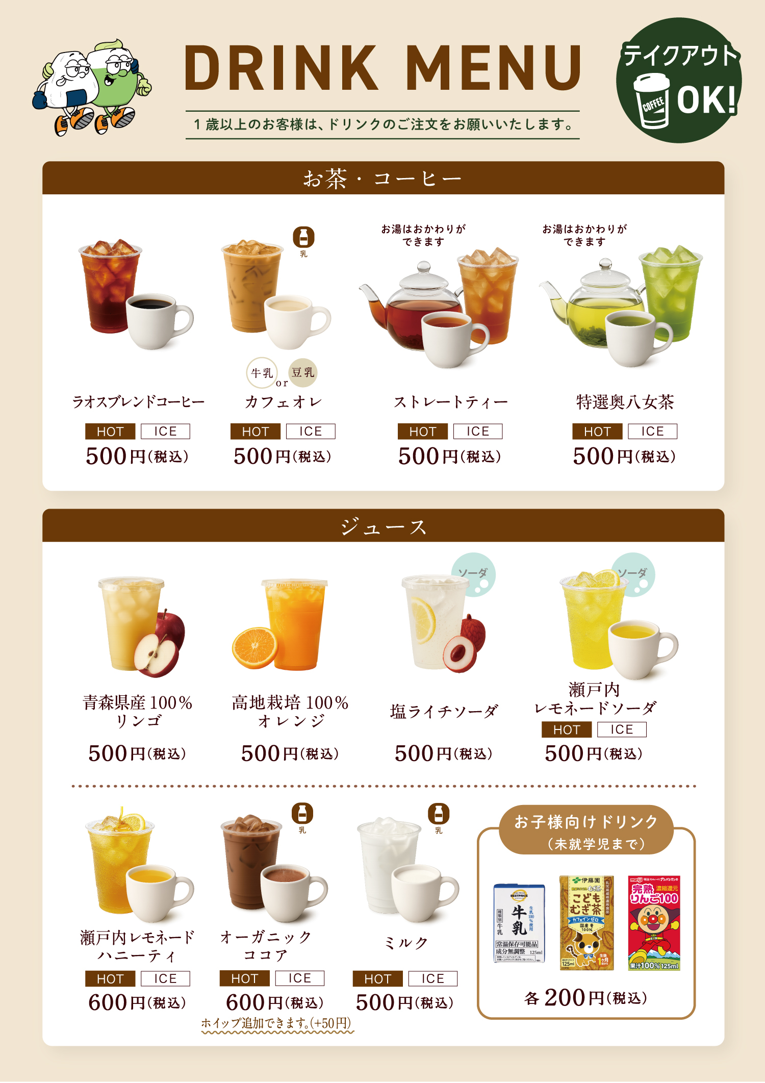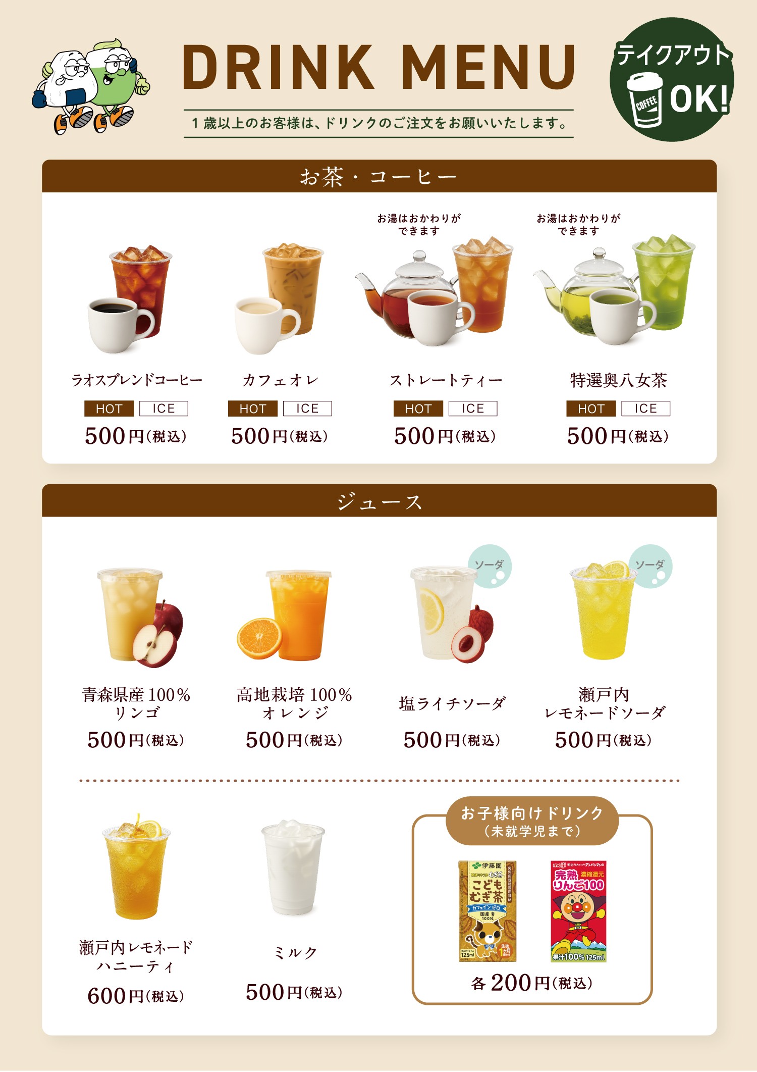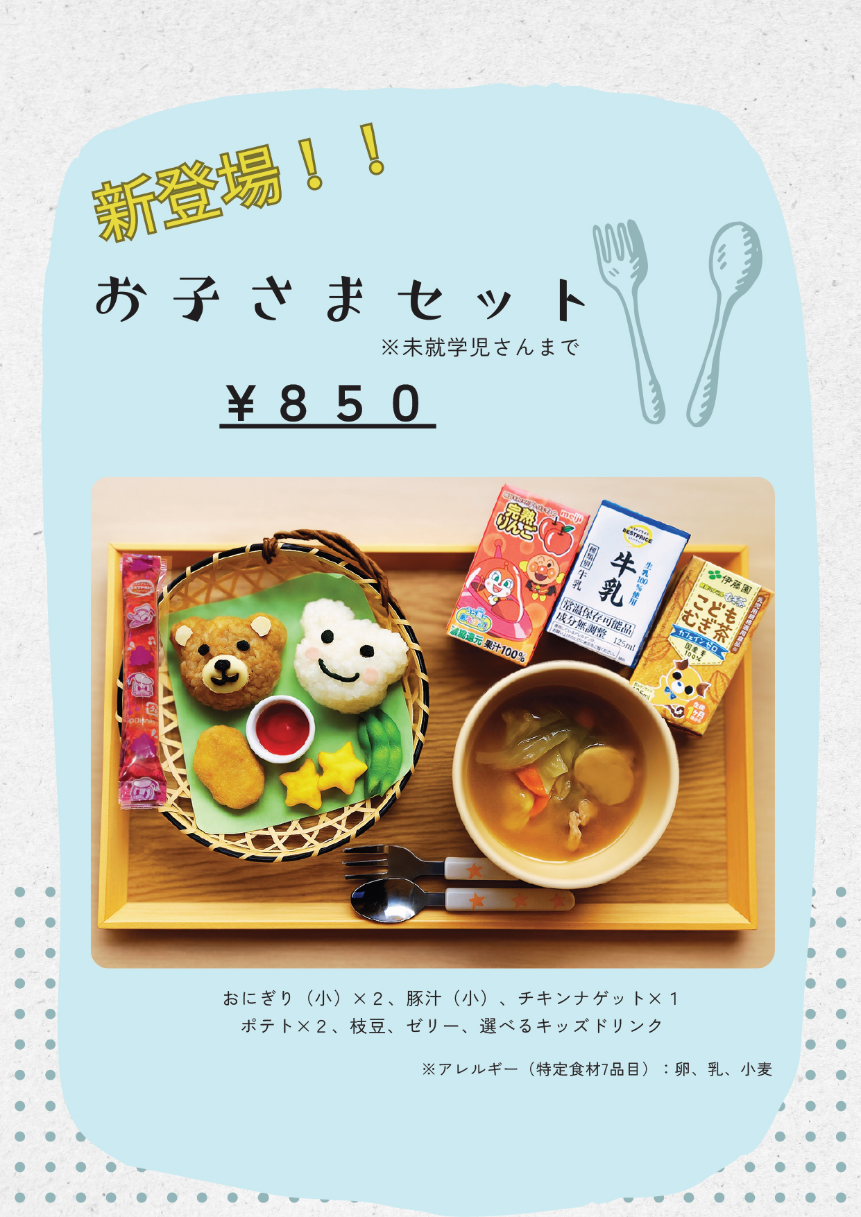 美味しい日本茶を浄水で丁寧に入れた緑茶や、青森県産のお米を浄水で炊いて作ったおにぎり、国産食材で作った豚汁、など、「体に優しいカフェ」をコンセプトに、お子様もご年配の方も安心してお召し上がりいただけるような食事を提供しています。