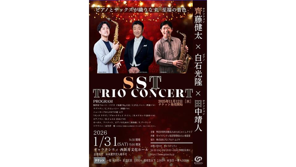 世界を舞台に活躍する3人の卓越した演奏家、齊藤健太(サクソフォン)、白石光隆(ピアノ)、そして2023年まで東京佼成ウインドオーケストラのコンサートマスターを務めた田中靖人(サクソフォン)が、夢のコラボレーションを実現します。
