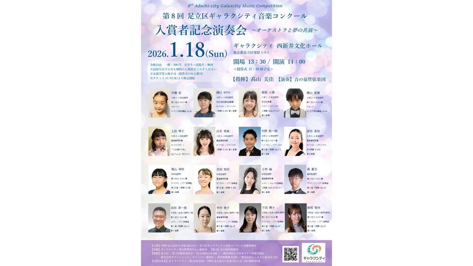 2026年1月18日(日)14:00開演(13:30開場)コンクール入賞者がギャラクシティ 西新井文化ホールでオーケストラと夢の共演!小学1・2年生、3・4年生、5・6年生、中学生、高校生、大学生~社会人の部門ごとに、受賞者15名がピアノコンチェルトのソリストとしてオーケストラをバックに演奏します。