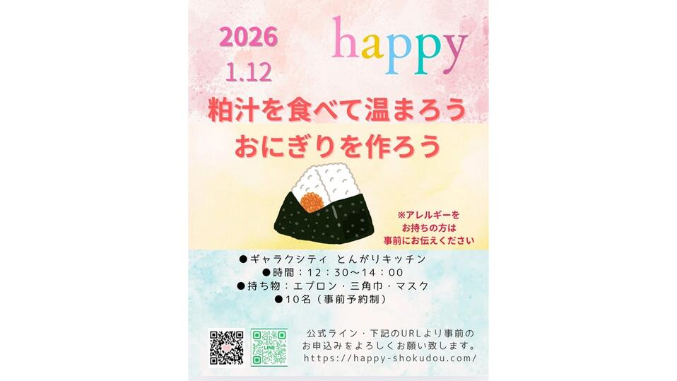 1月のメニューは「粕汁・おにぎり」です。詳しくはこちら
