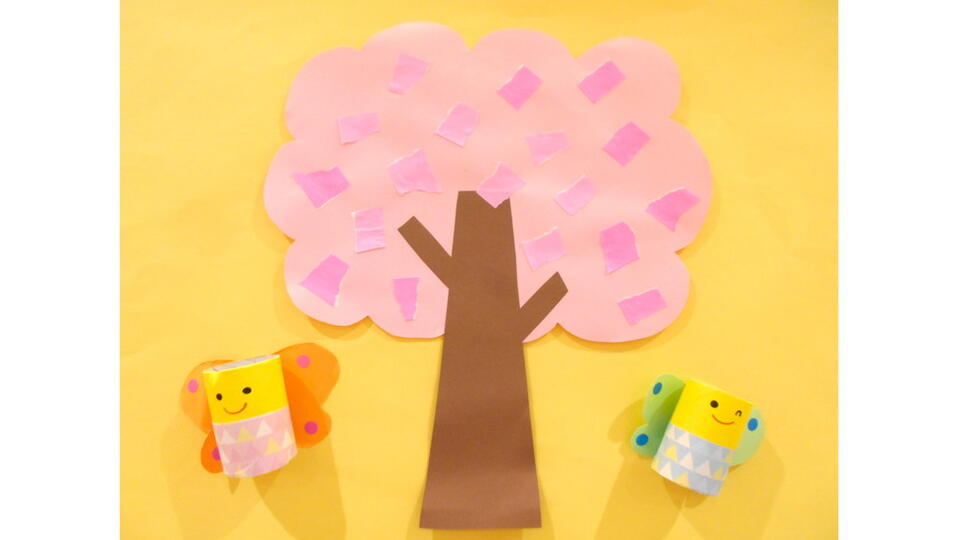 さくらの木型にちぎった色紙を花びらに見たてて、のりではろう。詳しくはこちら